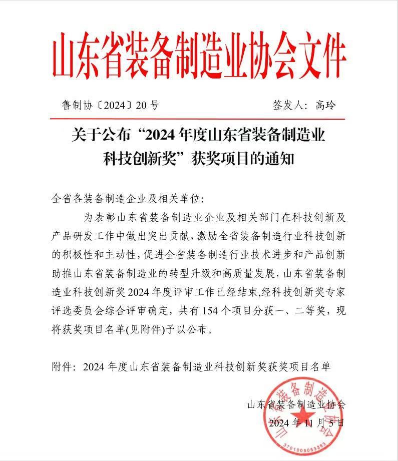 “2024 年度山東省裝備制造業(yè)科技創(chuàng)新獎”二等獎。